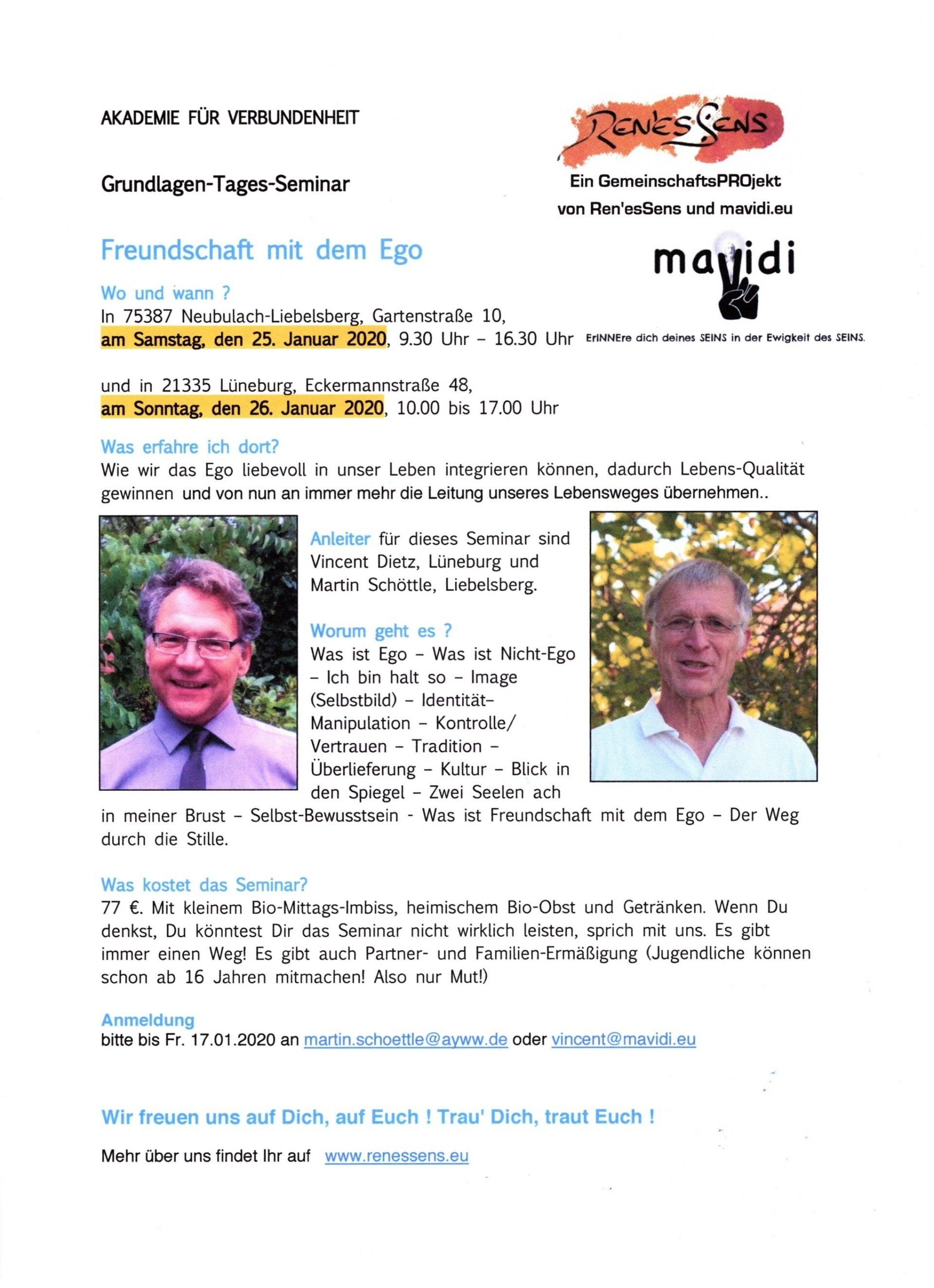 Da ein bewusster Umgang mit dem Ego (dem eigenen und dem der Anderen) entscheidende Voraussetzung für eine wahrhaftige und zielführende Kommunikation zwischen uns allen ist, reihen wir dieses Ein-Tages-Seminar unter unserer Grundlagen-Seminare ein.